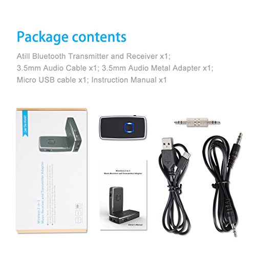Atill Bluetooth Transmitter and Receiver, 3.5mm audio cable, micro USB cable, instruction manual.