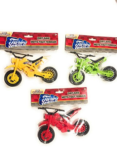 Studio : Greenbrier Publisher : Greenbrier Binding : Toy Product Description Toy dirt bikes feature authentic detail and are tons of fun for all the motorcycle lovers in your life. Green, Yellow, Red color swith individualized graphics. Perfect for gifts, prize boxes, party favors, stocking stuffers, Case includes 3(Green, Red, Yellow)) Ages 3 . 0