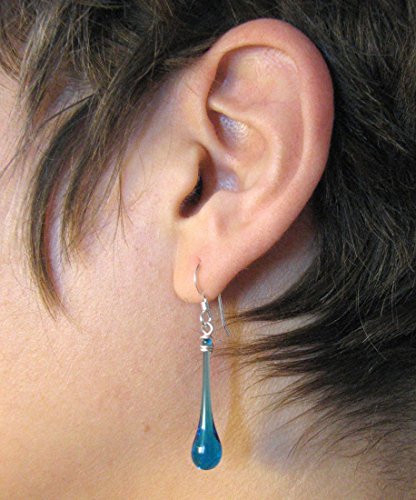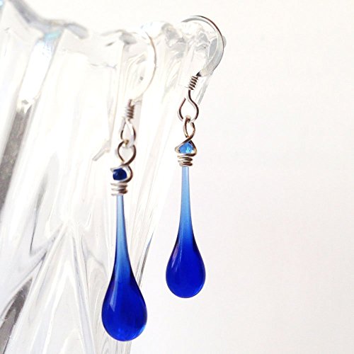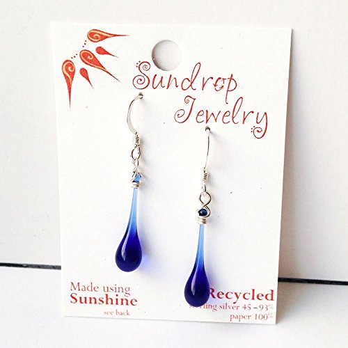 -. Title : Dark Blue Glass Drop and Sterling Silver Earrings, recycled from vodka bottles