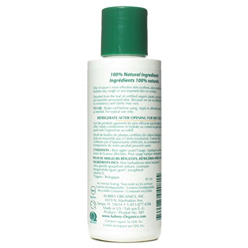 Pure Aloe Vera Liquid by Aubrey Pure Aloe Vera 4 fl oz (118 ml) Liquid Made with 98 Organic 4oz Nothings better for dry rough or sun-exposed skin than aloe. Ours is pure straight-from-the-leaf aloe nature's finest skin hydration and soothing agent. Be sure to carry a bottle in your beach bag or backpack for those times when you overdo and keep one in your refrigerator for a cool pick-me-up. INGREDIENTS INCI Aloe barbadensis (aloe) leaf juice Citrus Grandis (Grapefruit) Extract Cyamopsis tetragonoloba (guar) gum tocopherol (vitamin E). Organic Certified organic by QAI Inc.