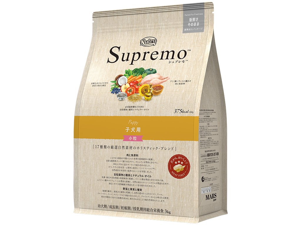 原料しなやかな筋肉や均整のとれた体型の健康維持に配慮し、良質な動物性タンパク源であるチキン、カルニチンを豊富に含むラム、DHA・EPAに富むサーモンを組み合わせました。かつ、チキン生肉を第一主原料に使用し(ミート ファースト)、自然素材が本来持つ抜群のおいしさを実現しました。
