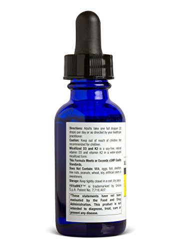 One Full Dropper (20 drops) Contains:Micellized D3 + K2 is a soy free, natural vitamin D3 and vitamin K2 in a water-soluble micellized form. Micellization greatly increases the solubility, absorption and bioavailability over oil or emulsified forms.