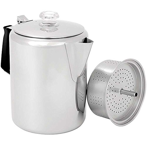 -. Feature : Camping percolator for making coffee on the camp stove / Corrosion-resistant, marine-grade 18/8 stainless-steel construction / Virtually unbreakable PercView top made of Lexan resin; hinged lid / Dishwasher-safe for easy cleaning; lightweight, portable design / Comes in several sizes, from small (3 cups) to extra large (28 cups)