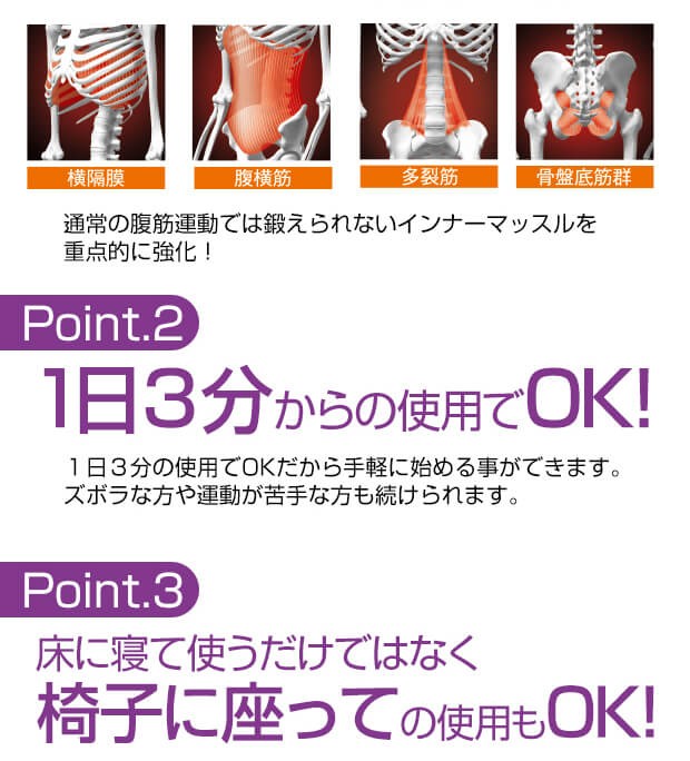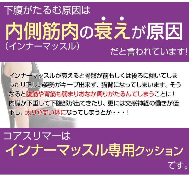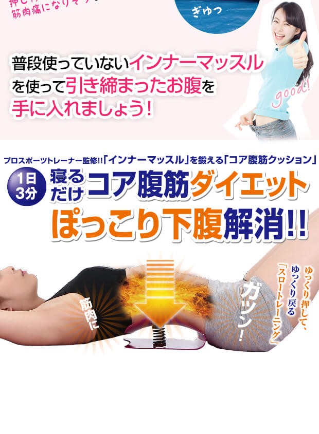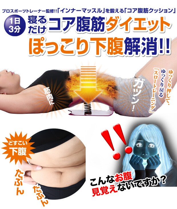 | 商品説明 | 1日3分 寝るだけコア腹筋ダイエット ぽっこり下腹解消!! プロスポーツトレーナー監修!! 「インナーマッスル」を鍛える「コア腹筋クッション」 下腹がたるむ原因は内側筋肉(インナーマッスル)の衰えが原因だと言われています。 インナーマッスルが衰えると骨盤が前、もしくは後ろに傾いてしまったり、正しい姿勢がキープ出来ず、猫背になってしまいます。 そうなると腹筋や背筋も弱まりお腹周りがたるんでしまうことに! ■4つのインナーマッスルを同時に鍛える!■ 通常の腹筋運動では鍛えられないインナーマッスルを重点的に強化! ■1日3分からの使用でOK!■ 1日3分の使用でOKだから手軽に始める事ができます。 ズボラな方や運動が苦手な方も続けられます。 ■床に座って使うだけではなく、椅子に座っての使用もOK!■ 座るだけで、イスでも簡単にコア腹筋が可能です。 普段は使っていないインナーマッスルを使って、引き締まったお腹を手に入れましょう! |