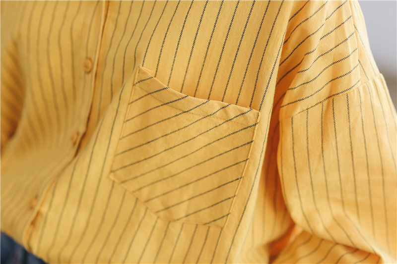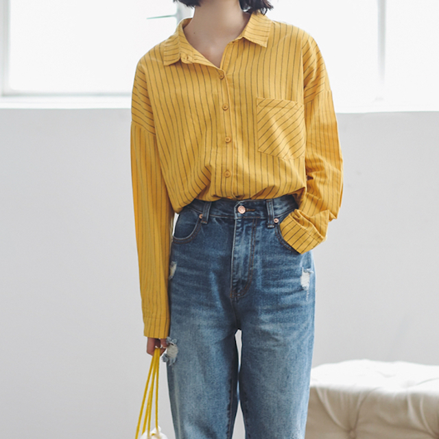 柔らかな素材が女性らしく、シンプルなデザインが大人っぽい雰囲気の長袖ストライプ柄シャツです。