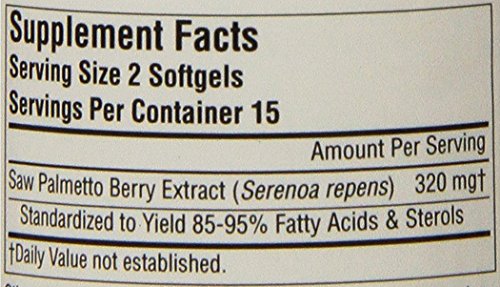 Suggested Use As a dietary supplement 1 to 2 softgels daily between meals. - Or as directed by your healthcare professional. Supplement FactsServing Size: 2 SoftgelsServings Per Container: 15Amount Per Serving% Daily Value***Saw Palmetto Berry Extract (Serenoa repens) Standardized to Yield 85-95% Fatty Acids Sterols320 mg ***Percent Daily Values are based on a 2,000 calorie diet