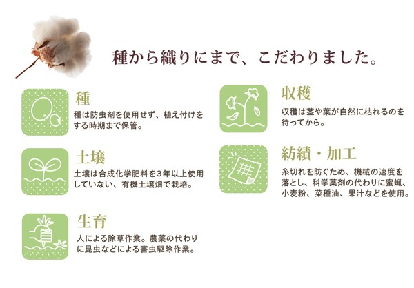 側地素材にオーガニックコットンを使用。無農薬の畑で丁寧に育てられた、人と環境にやさしいコットンです。その自然な風合いは気持ちよく、肌にもとびきりの優しさです。デリケートなお肌の方やお子様にも安心です。綿の産地、インド産の綿を使用しています。綿はポリエステルに比べ、静電気が起きにくく、繊維の中でも特に肌触りがよいのが特徴です。季節を選ばずオールシーズンご使用頂けます。ご家庭の洗濯機で洗えるので、清潔にご使用頂けます。