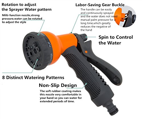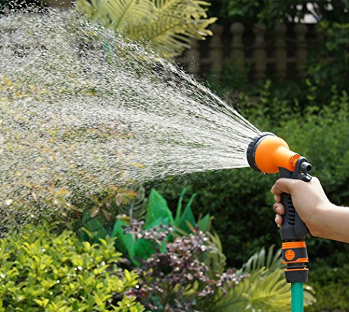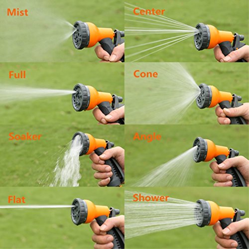 - ★8 Distinct Watering Patterns:For Every Watering Need!With this unique 8-pattern Nozzle you can do things from watering your plants, to cleaning your garage, or even wash your car if you so choose. Whether you need a high pressure jet to clean nooks and crannies, or a soft shower to wash your dog, The 10 watering patterns has everything covered.No Squeeze Nozzle, Easy Flow allows effortless garden, garage, Car Wash, watering and spraying.(8 Watering Patterns include ANGLE,SHOWER,MIST,CENTER,FLAT