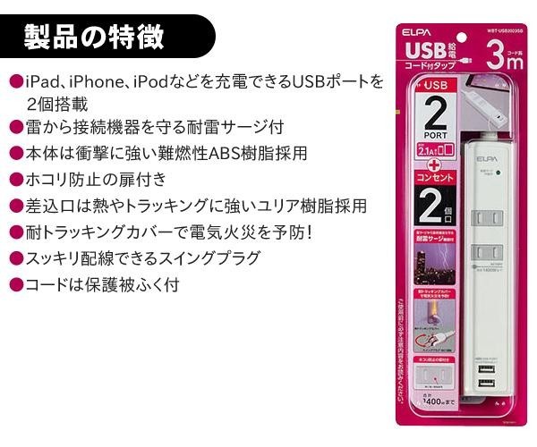 | 仕様 | AC差込口定格:AC100V 14A 合計1400Wまで 使用温度範囲:-10~40度 コンセント口数:2個口 屋内専用 USBポート定格:DC5.1V(最大2100mA・2ポート合計) コネクタ形状:USB Aタイプ(メス) USBポート数:2個口 |