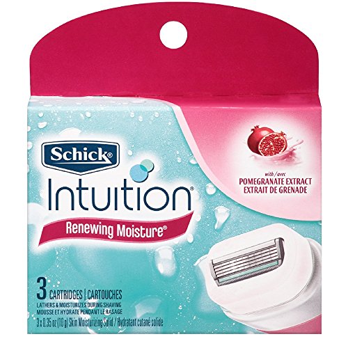 Studio : ENERGIZER PERSONAL CARE Publisher : ENERGIZER PERSONAL CARE Binding : Health and Beauty Product Description The Schick Intuition Renewing Moisture Refills are infused with pomegranate extracts for an invigorating shave. Schick Intuition is the first and only razor system that lathers, shaves and moisturizes during shaving - in one easy step - so there's no need to use shave gel. It also features a 4-blade pivoting head to glide smoothly along the contours of your legs and body. 0