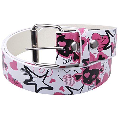 Product DescriptionCute, bubbly pink skulls-and-crossbones cover this white genuine leather belt, with black and pink doodle hearts and stars. Fun and cute with a girly punk flair, this is an awesome belt to liven up any outfit!0