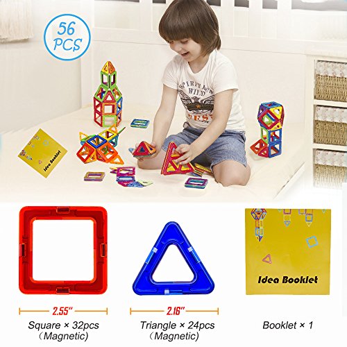 -. Feature : 【High quality & Affordable】: Totally 56pcs: including Magnetic Triangle x 24,Magnetic Quadrangle x 32,Booklet x 1,Storage Bag x 1, 2 different random colors on each side of each magnetic tile. More pieces in box with lower P.R.Ice.Compatible with other similar-size tiles, such as Magformers and Picasso, etc. / 【SAFE MATERIAL】: The Magnetic Blocks is made from non-toxic ,High quality Imported PC material conform to CE, ASTM-F9633 and EN71.Smooth edge of each tile will never hurt baby's little hands and the mouth. / 【UNLIMITED FUN】: 56pcs magnetic blocks toy set which comes in a beautiful variety of magnetic tiles colors that can attract children of all ages to pay attention and interest to play,can be combined into Many patterns, such as:House, plane,Train,cat, fish,ball and more. / 【DEVELOP SKILLS 】: These magnetic building toys Unique shape,free combination, Could develop children's fine motor development, cognitive development of color, teamwork ability, artistic cognitive, sensory, cognitive ability, practical ability, imagination and creativity. Best Educational stacking Blocks kits for your boys and girls. / 【CUSTOMER GUARANTEE】: We're so confident that you kids will love this magnets building blocks set that it's backed by our 100% Money Back Guarantee.If you child don't love it for whatever reason, we'll replace it or give you every cent back. That means that you either love it, or it's free!
