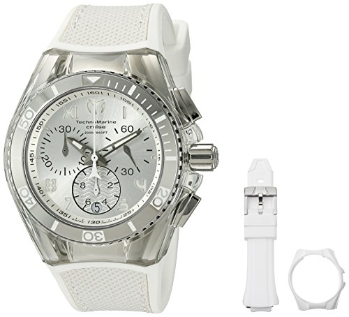 -. Binding : Watch -. Brand : TechnoMarine -. Department : unisex-adult -. EAN : 0886678978649 -. Feature : Chronograph functions with 60 second, 30 minute and 1/10 of a second; date window at 6:00; set includes: white silicone strap and white plastic case cover; screw-down crown; sapphire crystal / Silver dial with silver tone and white hands and white hour markers and Arabic numerals; luminous; unidirectional bezel; silver case with transparent plastic cover; white silicone strap / Swiss-quartz Movement / Case Diameter: 40mm / Water Resistant 200m (660ft): in General, Suitable for Professional Marine Activity and Serious Surface Water Sports, but not Diving -. Label : Swiss Watch International -. Manufacturer : Swiss Watch International -. Model : TM-115017 -. MPN : TM-115017 -. PackageQuantity : 1 -. PartNumber : TM-115017 -. ProductGroup : Watch -. ProductTypeName : WATCH -. Publisher : Swiss Watch International -. Studio : Swiss Watch International -. Title : Technomarine 'Cruise California' Swiss Quartz Stainless Steel Casual Watch (Model: TM-115017) -. UPC : 886678978649