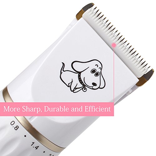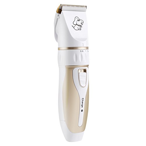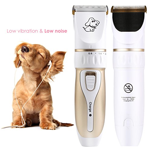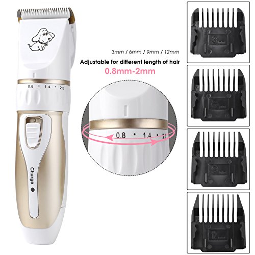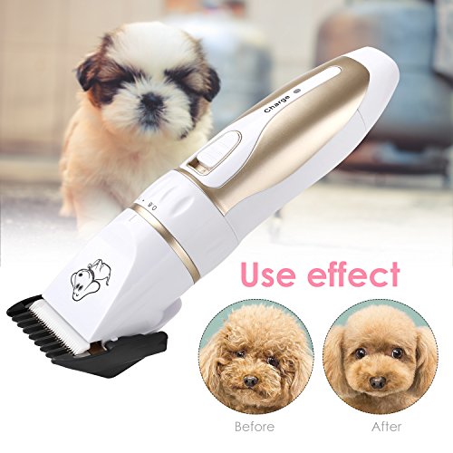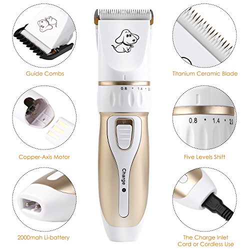 Our professional pet grooming clipper kit has five parts in all. You can have the electric clipper, a scissor, a nail clipper, a file and a comb, which helps you clip your lovely pets better. It is fairly cost-effective. Just one set, settle all your pets problems. Our product is rechargeable. It can work for 60 to 90 minutes when charged fully. It is fairly energy saving and environment protecting. The scissor can be used at the first step for long hair pets. Five levels shift and four guide combs make it easy to clipper any length you want for your pets. Don't worry about weather it is suitable for your pet. Our product suits all pets in the world. Low vibration and low noise features give your dog a quiet hairdressing time. The ceramic titanium cutter is more sharp, durable and efficient. We offer one year warranty. Don't hesitate, buy your lively dog a perfect grooming clipper.