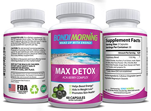 -. Title : Bondi Morning Max Detox Dietary Supplement – 100% Natural, Healthy & Safe New Formula, Pure Herbal Ingredients, Acai Berry, Papaya & Ginger, Promotes Colon Cleansing & Removes Toxins – 60 Capsules