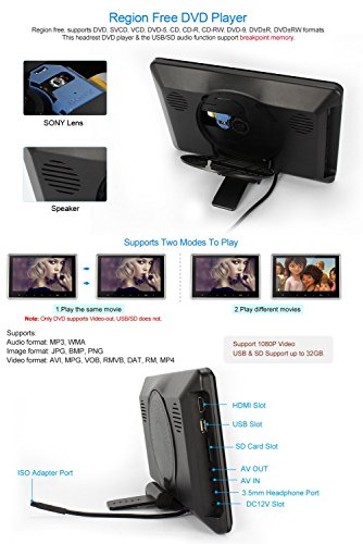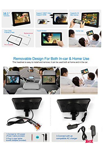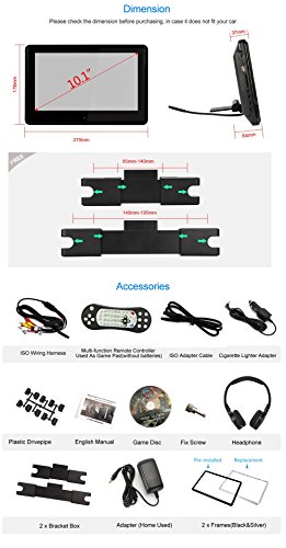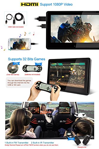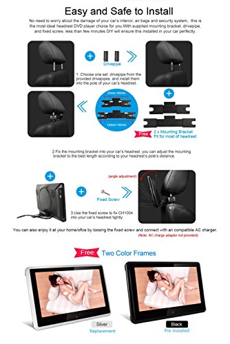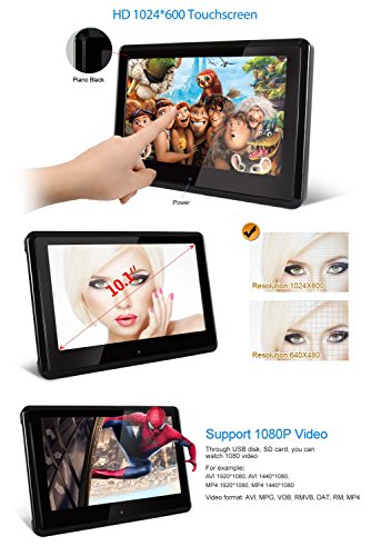 - Feature : Updated 10.1" HD 1024*600 touch screen: support 1080P videos, support AVI 1920*1080, AVI 1440*1080, MP4 1920*1080, MP4 1440*1080, etc / Perfect fusion: Ultra-thin and elegant design, comes with 2 brackets of different size and 2 FREE plastic frames--Piano Black and Silver for the headrest! Rounded design: protect children from being hit by the edges and corners of the DVD player when the car suddenly brakes. Removable Design: you can carry and use it both in car and at home / This headrest DVD player can work as a monitor when connect to your Raspberry Pi via HDMI port, enjoy the big surprise! / Built-in 2.0 USB port/SD/MMC card slot/IR/FM/Speaker/HDMI Input Port, and Built-in 32 bits wireless games Function, with Game Disc / Delivery via DHL (FBA orders not included). Expected to you within 4-9 days, and we offer 18-months warranty of replacing with defected parts (shipping charges not included)