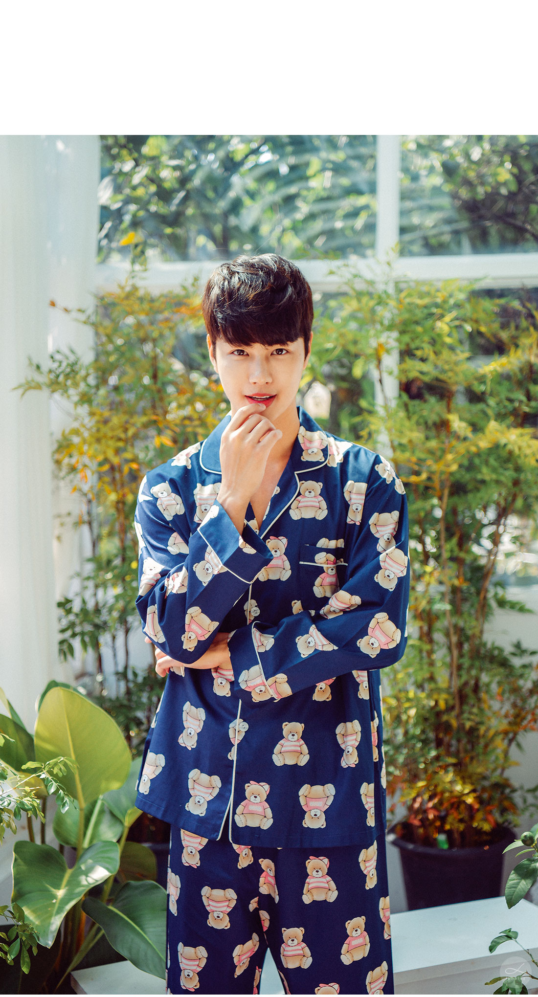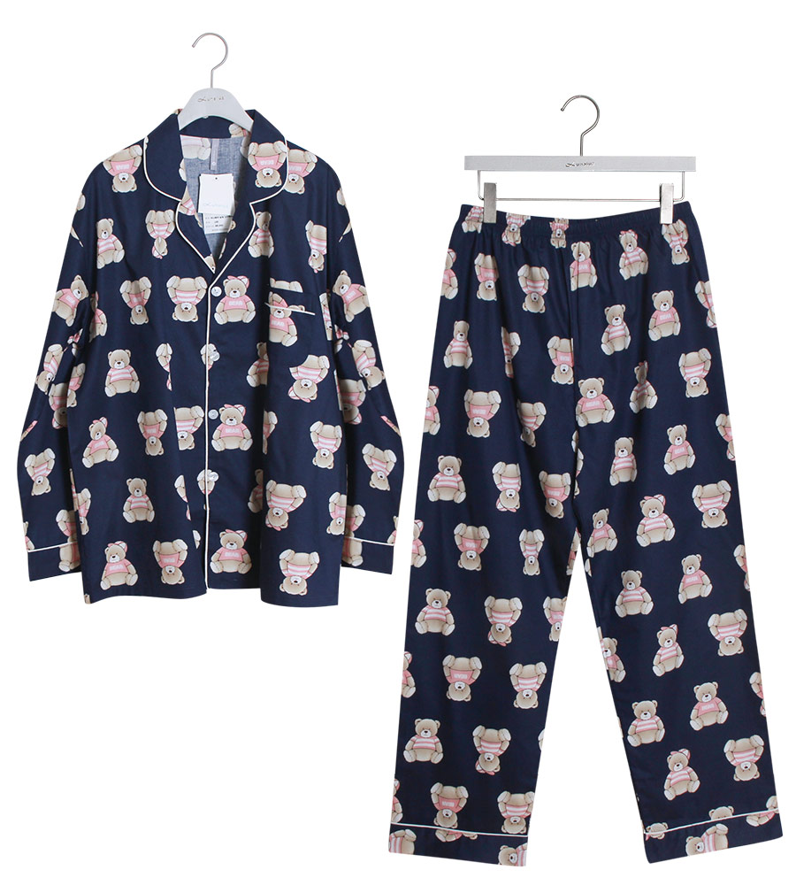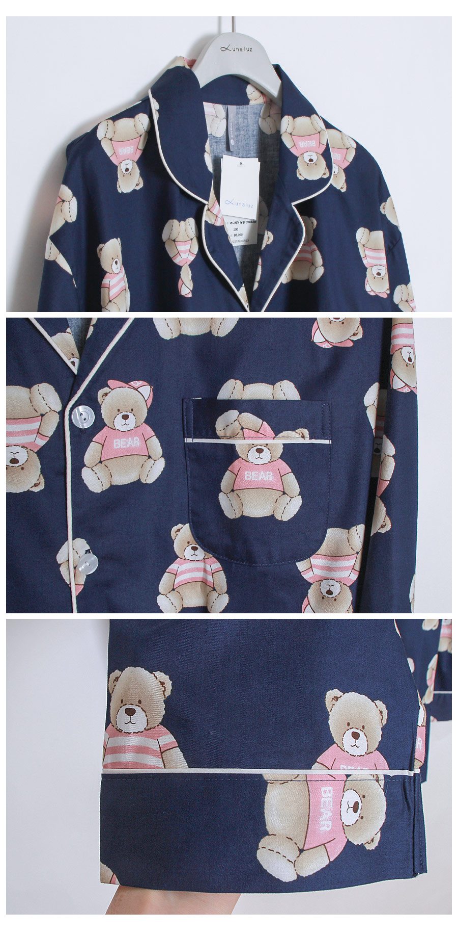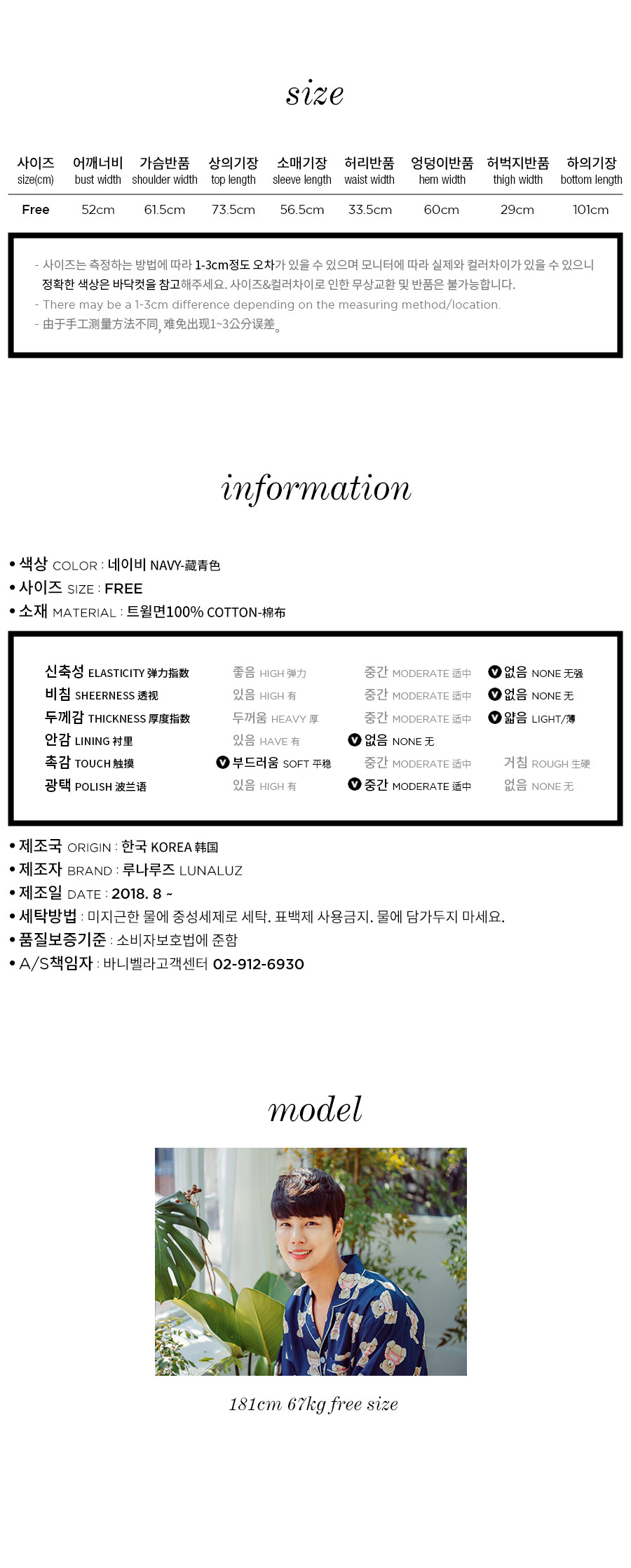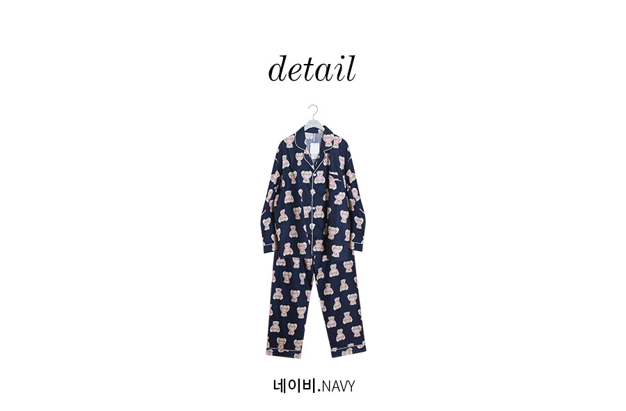직접 그린듯한 곰돌이 프린팅이 고급스러움을 더해주는 러블리 잠옷~! twill면으로 내구성이 좋고, 탄탄하며 표면의 은은한 광택이 감도는 소재랍니다. 피부에 닿는 느낌이 매끄럽고 좋아 숙면을 취하기 좋습니다. 통기성, 땀 흡수력 또한 우수해 잠옷 원단으로 많이 쓰이는 소재입니다. 깔끔한 진네이비 컬러 위에 직접 그린듯한 곰돌이 모티브를 넣어주어 귀엽고 러블리한 분위기가 도는 잠옷입니다. 커플, 신혼부부, 패밀리 잠옷으로도 적극 추천해드립니다 :) DETAIL 깔끔한 파이핑 포켓 카라 스타일의 파자마 디자인입니다. 카라의 끝 부분 부터 클로징 부분까지 크림 컬러의 파이핑을 꼼꼼하게 봉제 해 포인트를 주었습니다. 심플하고 깔끔한 디자인으로 두루두루 잘 소화할 수 있는 스타일이랍니다. 소매 부분과 팬츠의 하단에도 파이핑을 둘러주었습니다. 100% 국내 제작으로 소재, 디자인, 봉제의 퀄리티가 높습니다. SIZE 100size기준으로 제작된 free사이즈입니다.