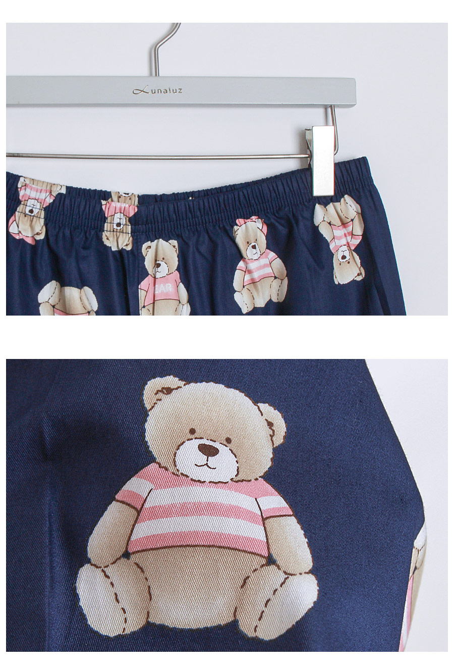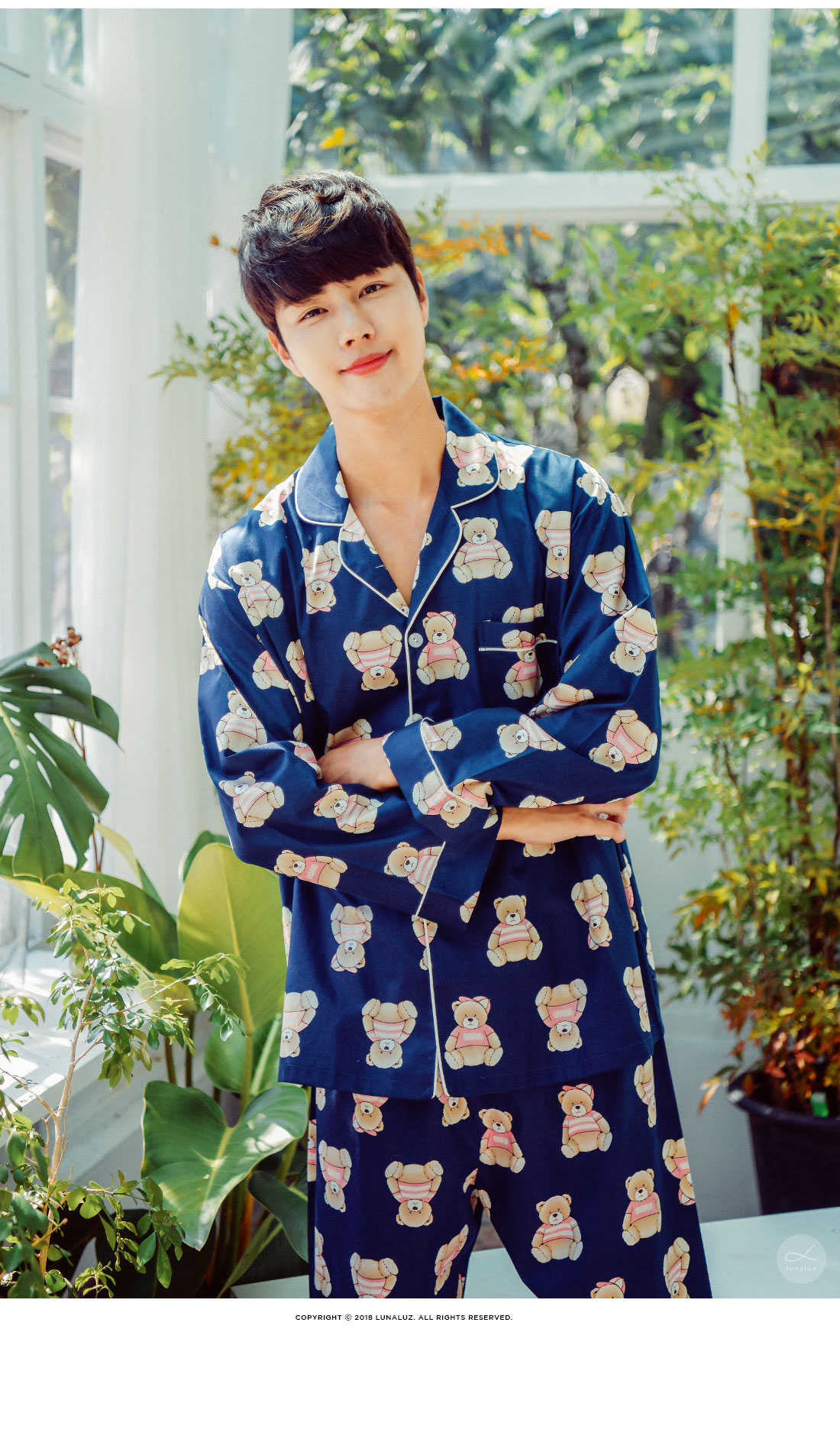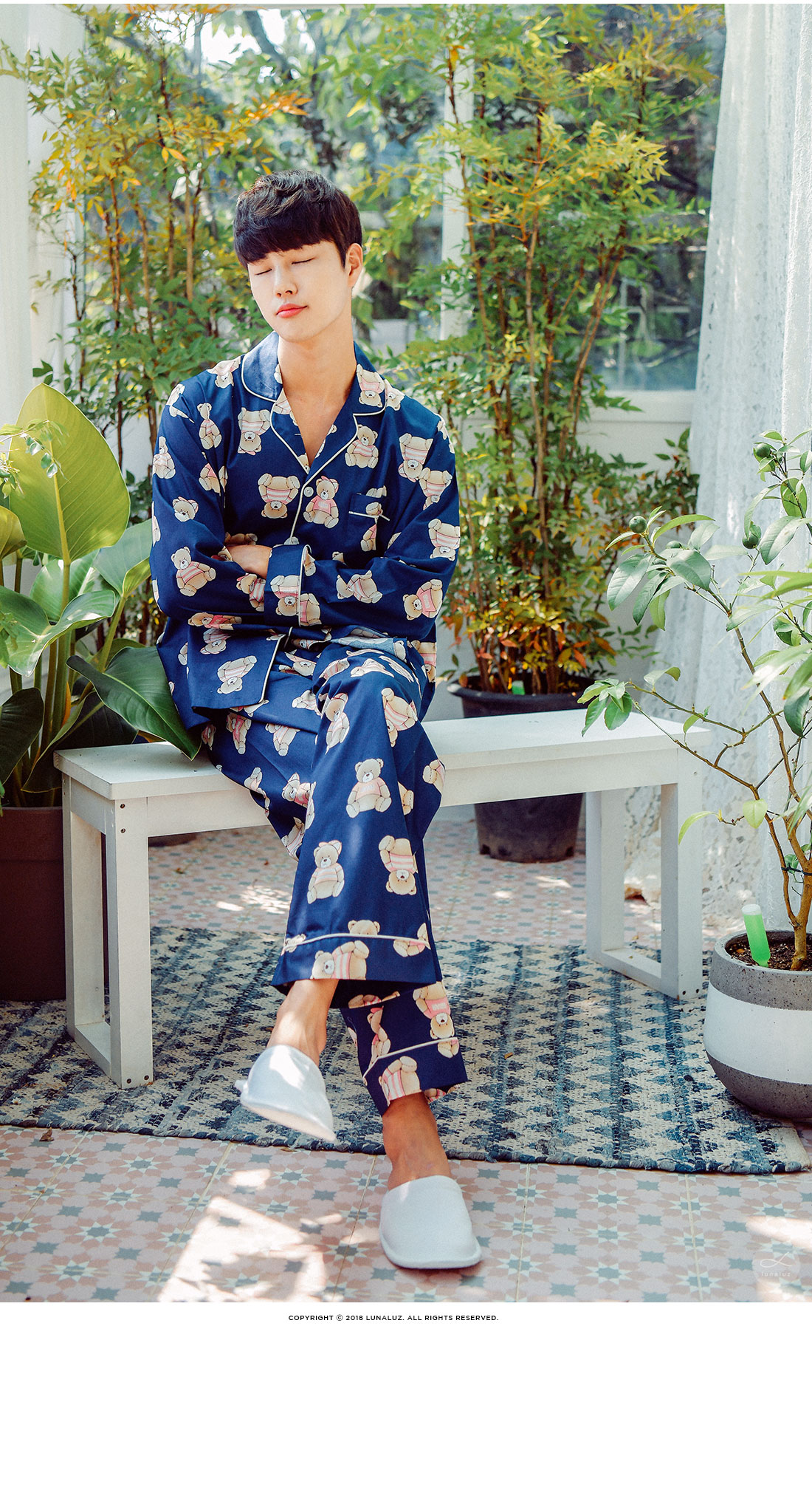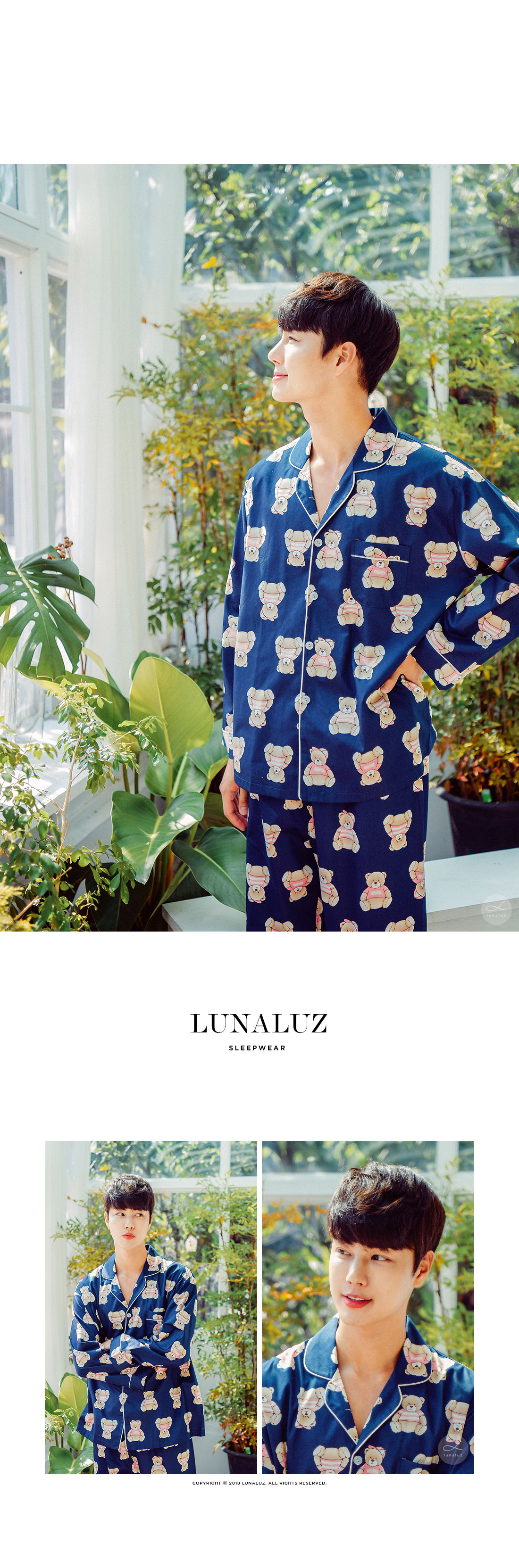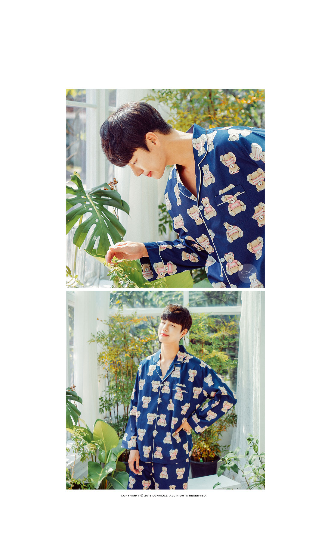 직접 그린듯한 곰돌이 프린팅이 고급스러움을 더해주는 러블리 잠옷~! twill면으로 내구성이 좋고, 탄탄하며 표면의 은은한 광택이 감도는 소재랍니다. 피부에 닿는 느낌이 매끄럽고 좋아 숙면을 취하기 좋습니다. 통기성, 땀 흡수력 또한 우수해 잠옷 원단으로 많이 쓰이는 소재입니다. 깔끔한 진네이비 컬러 위에 직접 그린듯한 곰돌이 모티브를 넣어주어 귀엽고 러블리한 분위기가 도는 잠옷입니다. 커플, 신혼부부, 패밀리 잠옷으로도 적극 추천해드립니다 :) DETAIL 깔끔한 파이핑 포켓 카라 스타일의 파자마 디자인입니다. 카라의 끝 부분 부터 클로징 부분까지 크림 컬러의 파이핑을 꼼꼼하게 봉제 해 포인트를 주었습니다. 심플하고 깔끔한 디자인으로 두루두루 잘 소화할 수 있는 스타일이랍니다. 소매 부분과 팬츠의 하단에도 파이핑을 둘러주었습니다. 100% 국내 제작으로 소재, 디자인, 봉제의 퀄리티가 높습니다. SIZE 100size기준으로 제작된 free사이즈입니다.