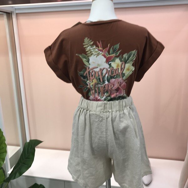 트로피컬 면티셔츠 브론즈 칼라카멜 브라운 느낌이 나는 오묘하고 고급스런 칼라!결코 더워보이거나 갑갑해보이지 않아요: 베이지,아이보리,화이트 하의랑 매치하니 굿 굿!넘 분위기있고 예쁘네요!^^