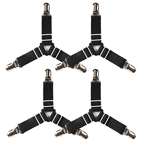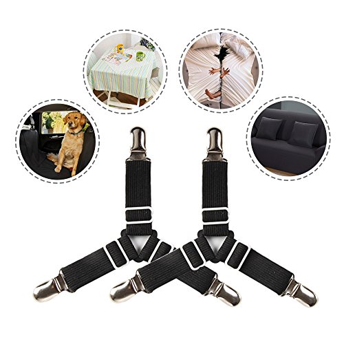 - Built in plastic clenching system protects fabric from harm. - Built with durable round elastic, nickel plated clamps with fabric protector and unique heavy duty bungee cord lock. - Easy to put on and keeps sheets in place and no more fixing sheets, adjustable length allows desired tension. - Fit to fitted or flat sheets on different type of beds such as standard size, odd shaped beds, foam beds, pillowtop beds, air mattresses, RV's and travel trailers and more. - Use cover fasteners and never worry about messy or wrinkled sheets again, eliminate the slipping of any bed sheets with these sheet fasteners. - Other uses: tablecloths covers, grill covers, cars seat cover, boats seat cover, motorcycle seat cover, scooters seat cover, couch seat cover, chairs seat cover, flat sheets, mattress pads, and even ironing board covers.