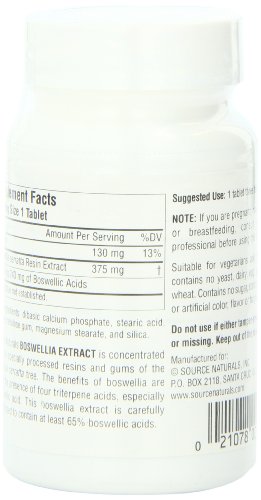 Studio : Source Naturals Publisher : Source Naturals Binding : Health and Beauty Product Description Source Naturals Boswellia Extract is concentrated from the specially processed resins and gums of the Boswellia serrata tree. The benefits of boswellia are due to the presence of four triterpene acids, especially ß-boswellic acid. This boswellia extract is carefully standardized to contain at least 65% boswellic acids. 0