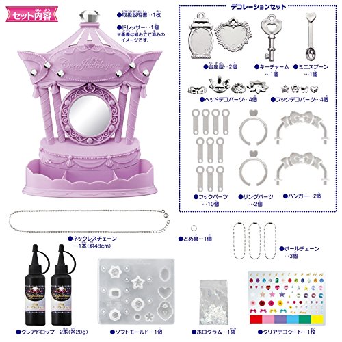 반짝반짝과 빛나 빛나는 쥬얼리를 만들 수 있는 클레어 쥬얼리 없음 leads의 DX사양이 등장!!안심 안전한 수용성 레진액을 사용해,태양빛(자외선)나와 굳혀 본격적인 레진 악세사리 만들기가 즐길 수 있다. 세트내용에 넥크리스와 링도 만들 수 있다,처음인 본격 악세사리 만들기에 최적인 도입세트. 【구조 방법】 1,좋아하는 몰드로 레진액을 넣는다.이 때 클리어 데코 씨트나 홀로그램,데코레이션세트에 있는 비즈 등을 넣고 어레인지 할 수 있는. 2,양이 당첨되는 창가,혹은 밖에서 닛코에 얹어 경화 시킨다.(화려한 일에 약90분) 3,몰드의 것이 하부터 꼭 몰려 나가 굳어진 쥬얼리를 꺼내어 완성! 【세트내용】 (서랍이 여러 개 있는 침실용) 옷장 스탠드×1,데코레이션세트×2,넥크리스 체인×1,소프트 몰드×1,클레어 드롭×2,클리어 데코 씨트×1,볼 체인×3,환캄파니아(Kampaniya)《―츠》×1,홀로그램×1 대상 연령:6 재이상