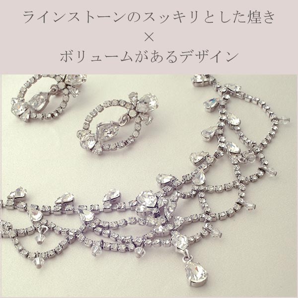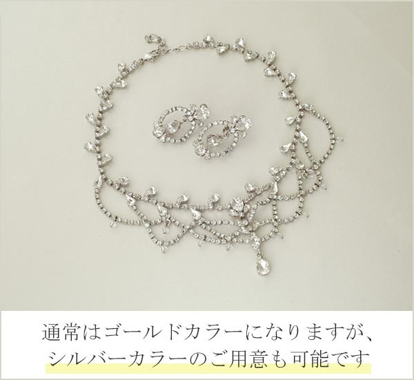 ボリューム感もたっぷりでゴールドを基調としたネックレス・イヤリングともに存在感のあるウエディングアクセサリーです。