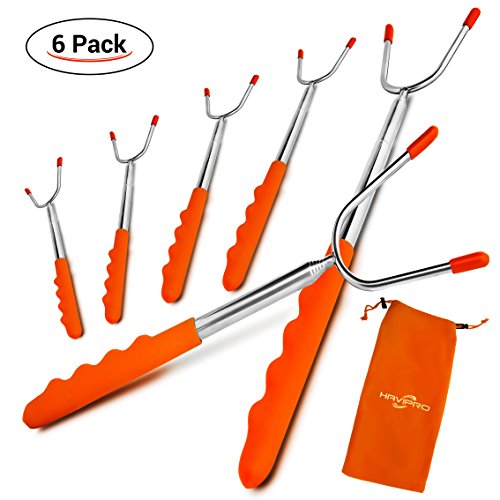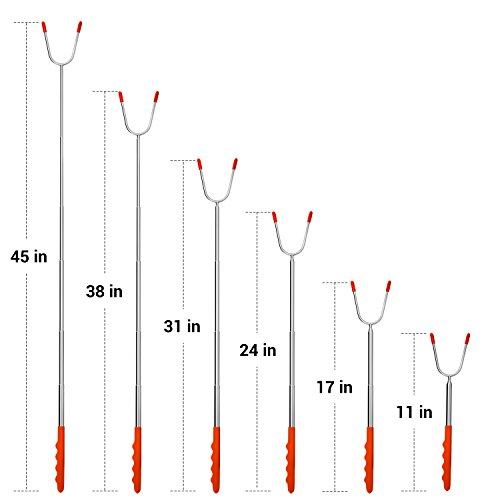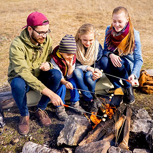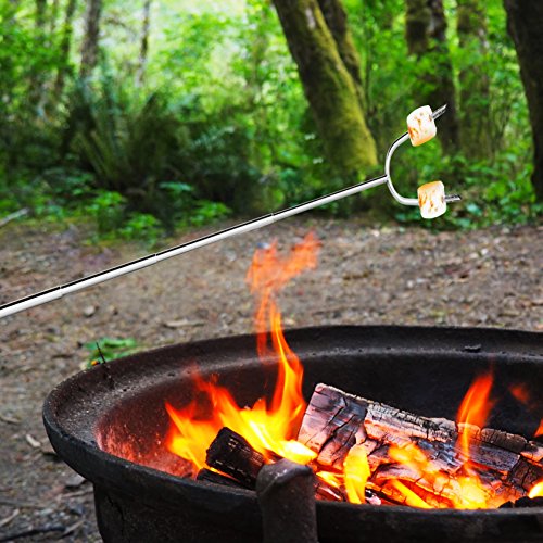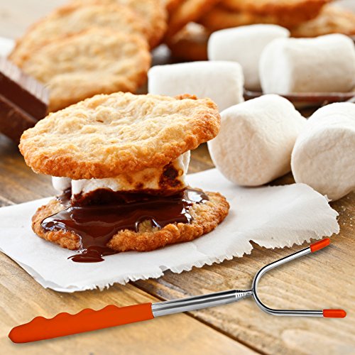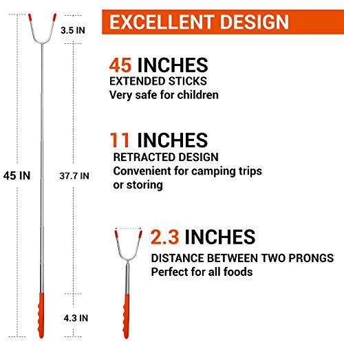 ? Allow you and your kids to stand at safe distance from the fire ? Safe for your health: Non- toxic 304 stainless steel material, FDA approved ? Meet all your expectation for different length: Sticks can be adjustable ? The entire heavy duty construction can hold up to 1.43 lbs ? Convenient to move delicious food from the grill to the serving plate ? Avoid burning your hand thanks to Heat-resistant rubber handle ? Comfort handle: Finger indents design gives you a firm grip ? Cost-saving: Reusable sticks will last, solid 304 stainless steel metal won't break and won't rust as cheap skewers, not disposable. ? Easy for hanging and storage: Collapsible feature makes the cooker stick to become a mini product ? Always smile when roasting foods: Highest quality materials, great lifetime guarantee and best customer service ? Easy to clean, dishwasher safe.