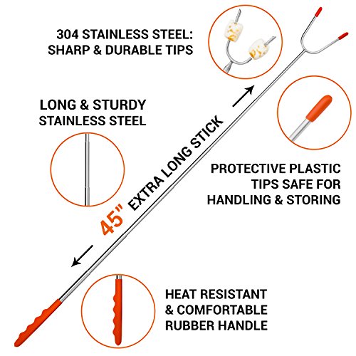 ? Extendable lengths: 45 inches ? Retractable lengths: 11 inches ? Color: Orange ? Weight: 1.2 lbs ? Material: 304 stainless steel, rubber handle, plastic covers ? A set includes: 6 sticks, a canvas pouch ? Best use: Camping, fire pit, patio, backyard, bonfire pit, indoor and outdoor kitchen, barbecue grill. How to choose a Marshmallow Roasting Stick?
