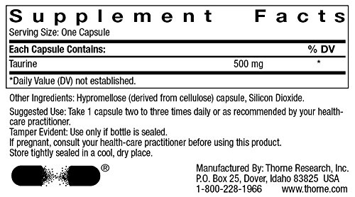 -. Binding : Health and Beauty -. Brand : Thorne Research -. Label : Thorne Research -. Manufacturer : Thorne Research -. ProductGroup : Health and Beauty -. ProductTypeName : HEALTH_PERSONAL_CARE -. Publisher : Thorne Research -. Studio : Thorne Research -. Title : Thorne Research - Taurine (500mg) 90 Capsules