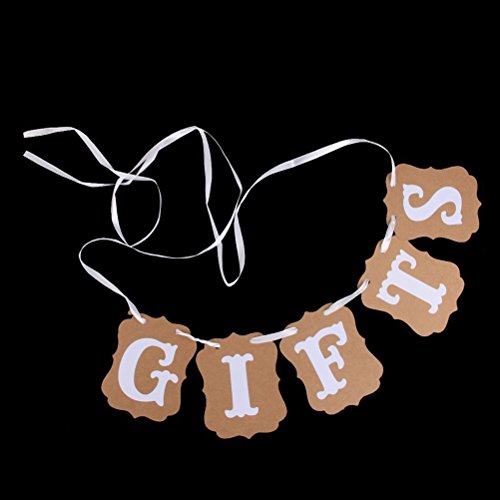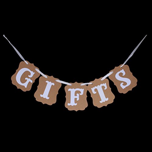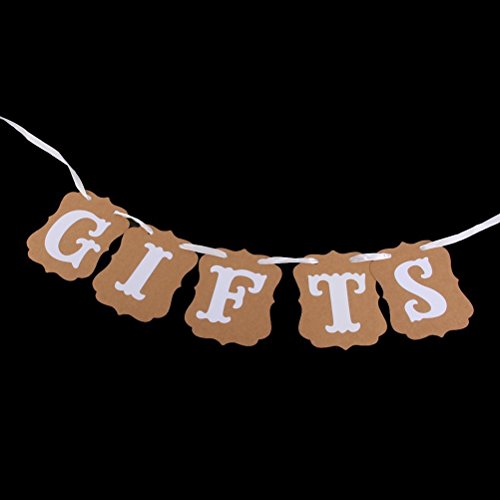 - Color: mainly brown, white. - Made of cardboard paper with ribbon. - Ribbon length: Approx 2.4m / 2.6 yd. - Single card size: Approx 13*10cm / 5.12*3.94 inch. - GIFTS wedding party banner. - 1 set includes: 5pcs banners and 1 rope - Suitable for wedding party, wedding ceremony use. - Note: rope and cards come separately, you must bind them with the rope. Package Including 1 * GIFTS Card Paper Bunting Banner Wedding Party Favors (Brown) 0