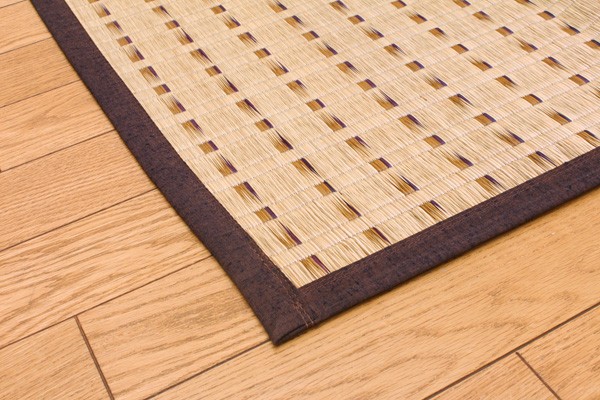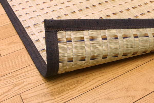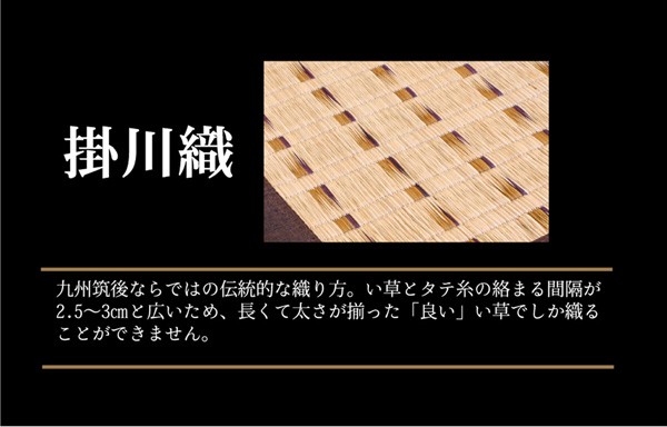 染料、染土を使わない国産(九州産)のしなやかなイ草使用し、スベスベとした気持のよい肌触りに仕上げました。掛川織は九州筑後地方の伝統的な織り方です。大きな目と小さな目に交互に織り込んだ美しく洗練されたモダンなデザインが人気です。また、厳選された良質の太く長いイ草を高密度に織り込んでいますので丈夫で耐久性があり、しかも素足に心地よいクッション性とボリューム感があります。国産(九州産)のい草を使用しています。一本一本が太く、表皮が厚く繊維がキメ細かいので弾力性があり、耐久性に優れています。い草には空気の自然浄化作用、湿度の調節作用などがあります。また汚れにくく、使用するうちに黄金色に変化し味が出ます。い草に青森ヒバ加工を施しています。(抗菌、防臭効果)通常のイ草カーペットよりも小さく折り畳むことが出来るコンパクト収納タイプです。