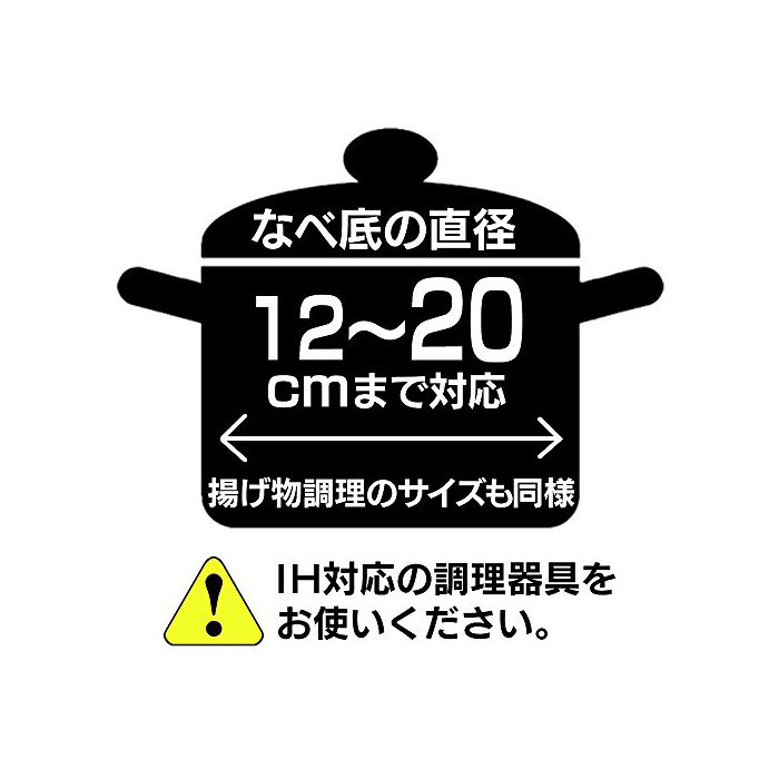 사용 가능 냄비 크기:직경12~20cm 재질:철,철주물,내열 법랑,스테인레스(18-0,18-8,18-10)고, 다층강냄비 ※종류 에 따라서는 사용해라 없는 것이 있습니다 형상:바닥이 평탄한 것,휘가 3mm이하인 것(튀김 조리 때는 휘가 1mm이하의 냄비 사용)※IH조리기에서는,재질이나 크기에 의해 쓸만한 냄비와 사용할 수 없는 냄비가 있습니다.