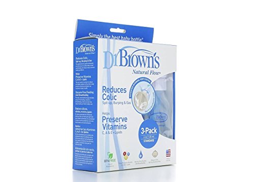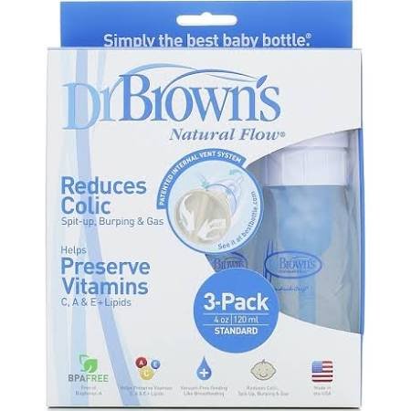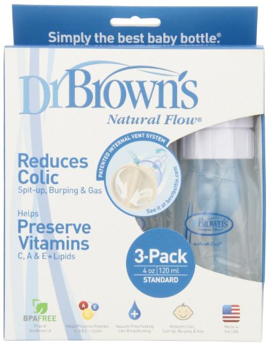 -. Binding : Baby Product -. Brand : Dr. Brown's -. Feature : Helps colicky babies settle down or sleep / Reduces colic, spit up, burping and gas / Helps prevent fluid in the ear or no vacuum / Easy to clean, dishwasher safe. BPA free -. Label : Dr. Browns -. Manufacturer : Dr. Browns -. ProductGroup : Baby Product -. ProductTypeName : BABY_PRODUCT -. Publisher : Dr. Browns -. Studio : Dr. Browns -. Title : Dr. Browns BPA Free Polypropylene Natural Flow Standard Neck Bottle, 4 oz - 3-Pack (Discontinued by Manufacturer)