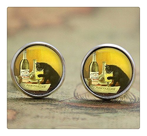 -. Title : 黒猫のピアスのビンテージ広告アブサン酒を飲む猫アートプリントガラスピアスイヤリング