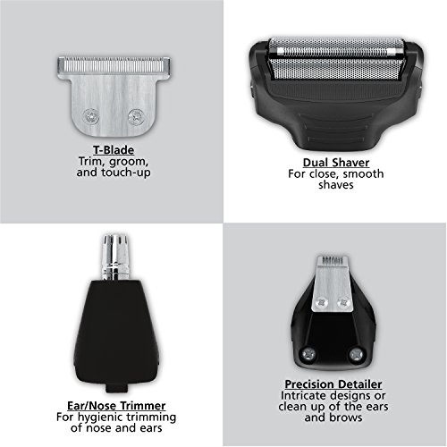 - 4 Different Attachments Heads let you achieve your best grooming style and authentic look: - wide T-blade for beard and mustache trimming, hair cuts, touchups, body grooming and detailing: - Rotary ear and nose trimmer for hygienic trimming: - Precision detailer for clean up and designs: - Dual Foil shaver for close shaves