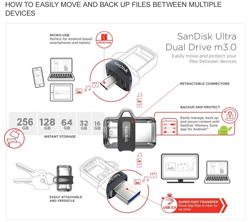 The SanDisk Ultra- Dual Drive m3.0 makes it easy to transfer content from your phone to your computer. With a micro-USB connector on one end and a USB 3.0 connector on the other, the drive lets you move content easily between all your devices-from your Android smartphone or tablet to your laptop. PC or Mac computer. The USB 3.0 connector is high-performance and backward-compatible with USB 2.0 ports. This flash drive for your Android devices includes the SanDisk Memory Zone app for automatic camera roll backup and easy file and media management.