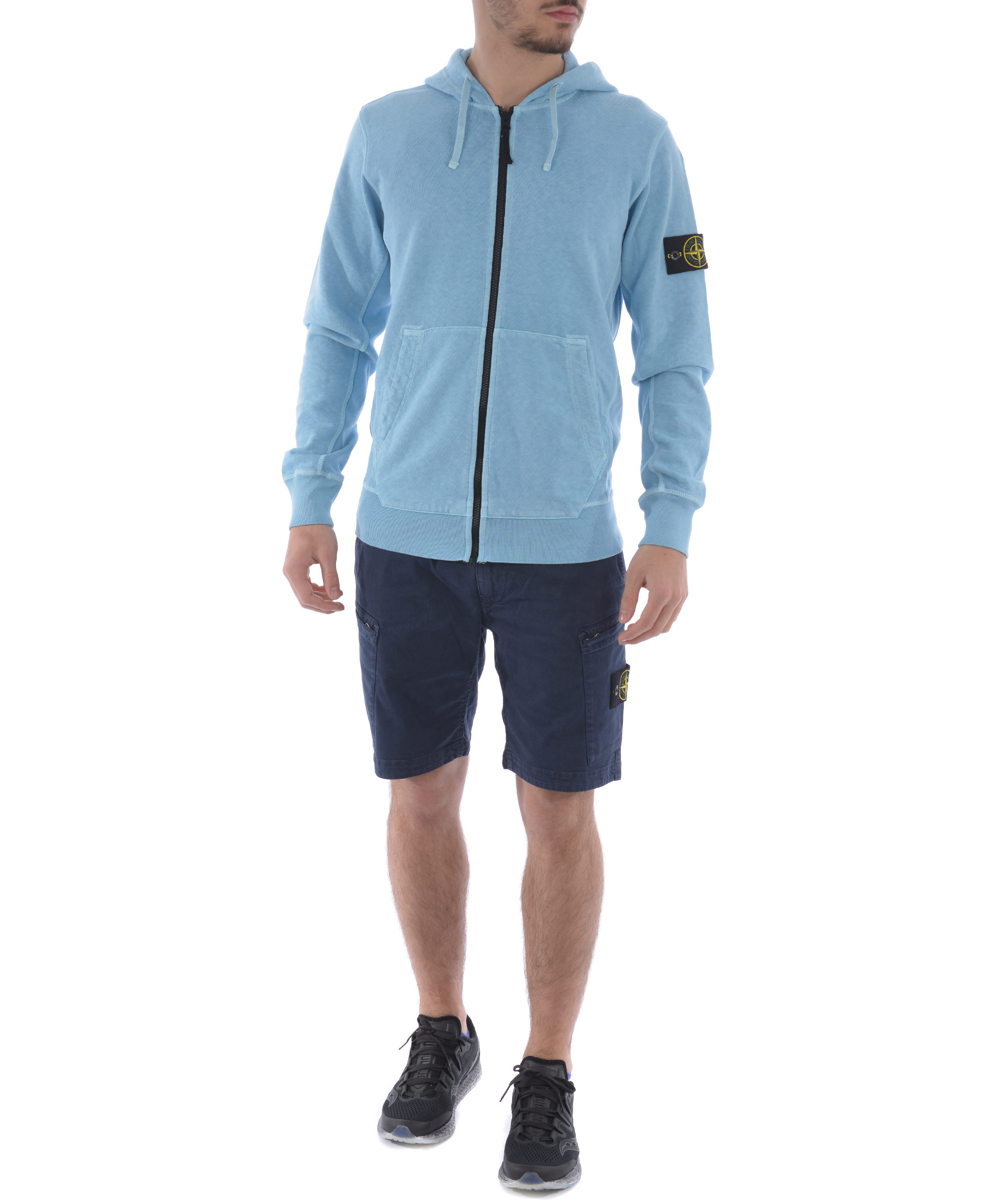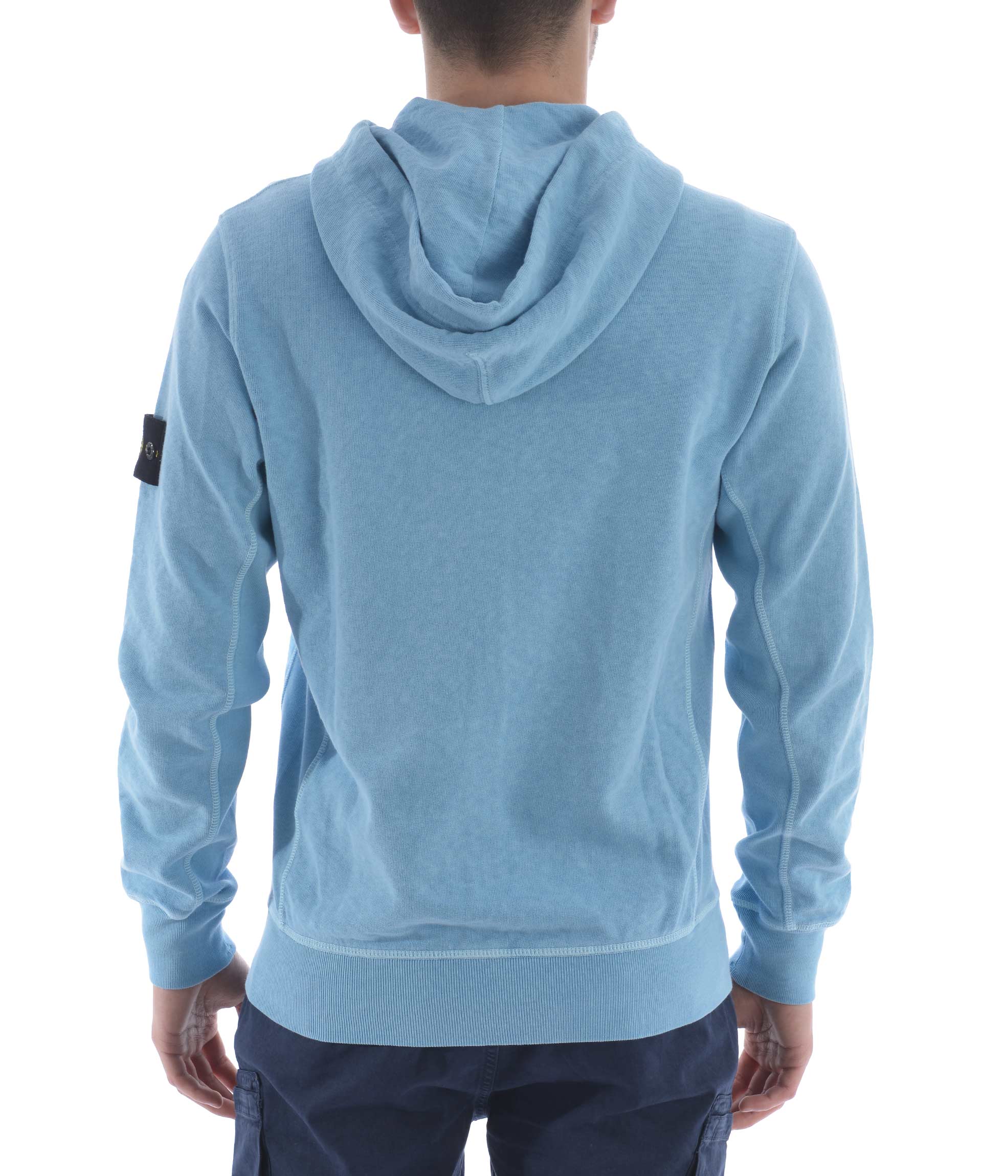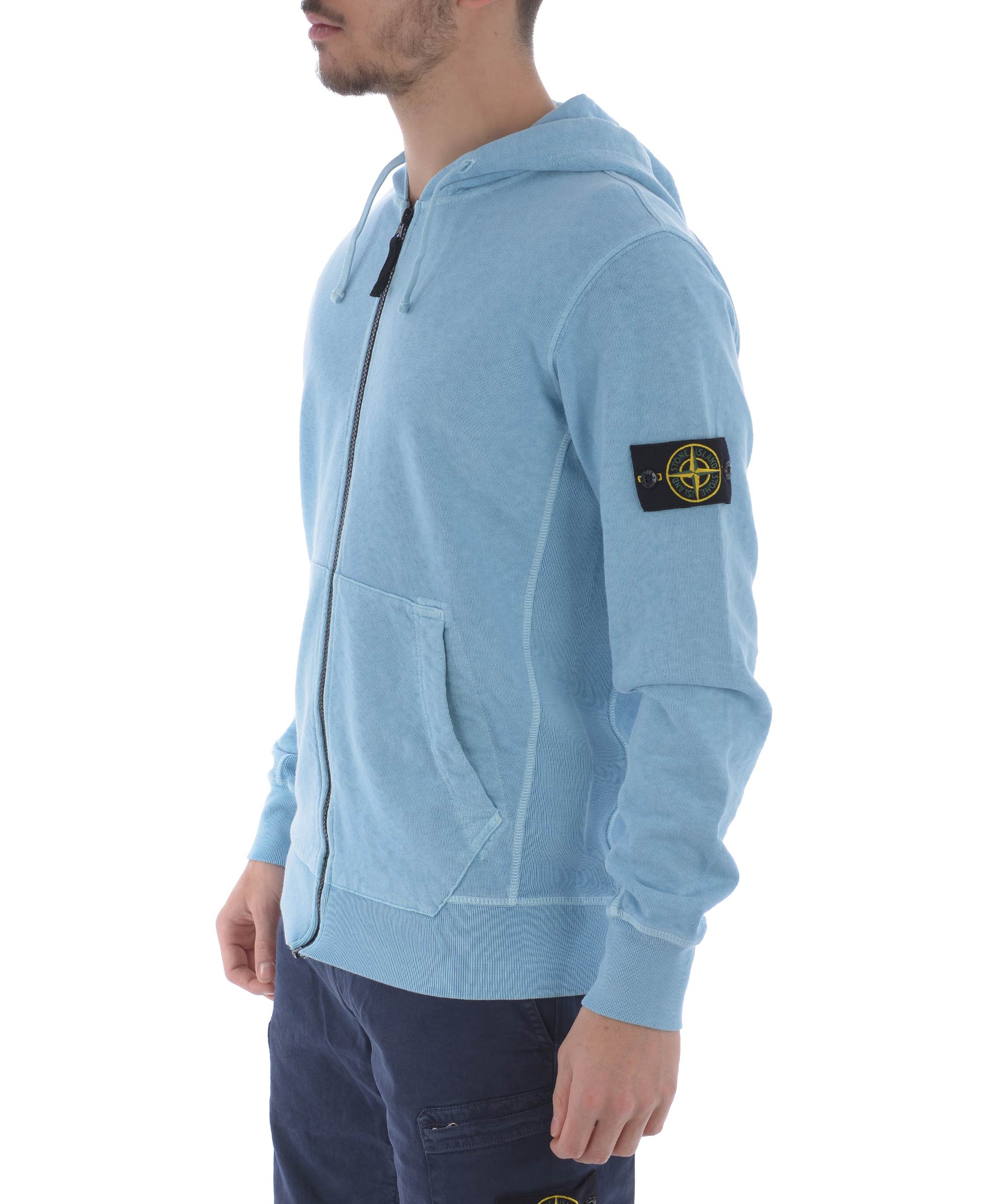 Felpa Stone Island in cotone malfilè Celeste effetto old. Cappuccio con coulisse. Chiusura con zip. Tasche frontali. Polsi e fondo a costine. Patch logo in lana sulla manica sinistra, removibile. Misura in foto S 100% cotone