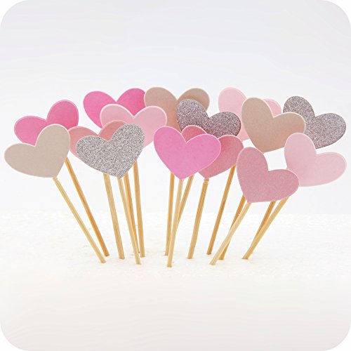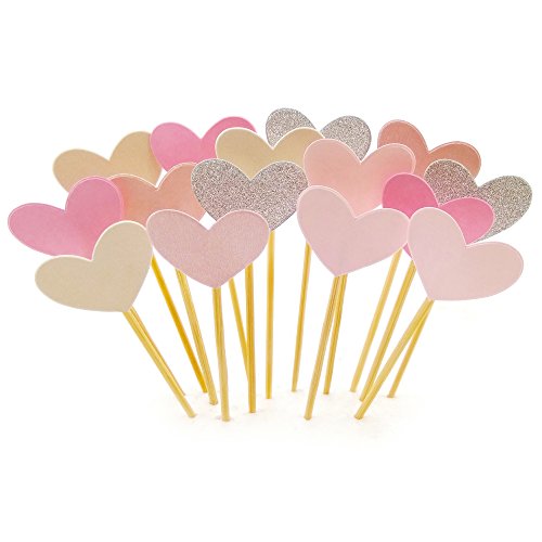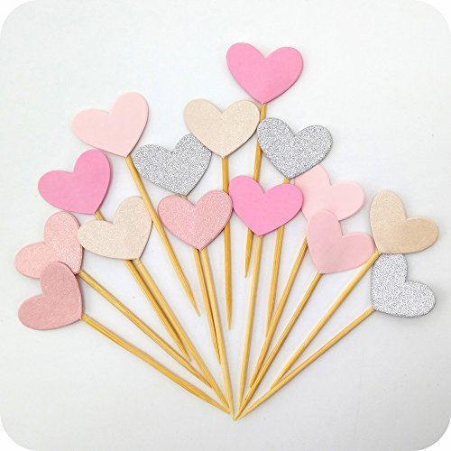 Cupcake Toppers 50Pcs Set, GUGUJI Funny Pink Heart DIY Glitter Mini Birthday Cake Snack Decorations Picks Suppliers Party Accessories for Wedding and Baby Shower