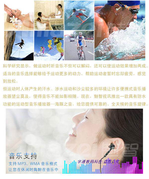 防水MP3设计新颖独到,您可以用来早晨跑步,可以在游泳,冲浪,慢跑,洗澡,淋浴,桑拿,按摩时候使用该产品,完全防水,防水MP3,防水耳机。冬天来了,您也可以戴者这款运动型MP3滑雪,早晨慢跑,夏天来了,可以游泳,去沙滩晒太阳,旅游时候,戴上它,爬山游玩。是您运动佳品,让您享受美好音乐,劲享情趣人生。本防水运动MP3轻巧便捷,只需充2个小时电就可用8个小时,防划耐腐蚀的铝合金外壳,增添靓丽外观!