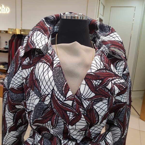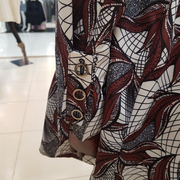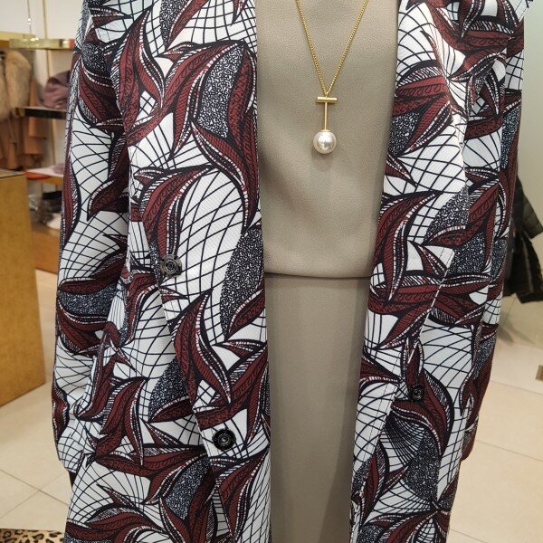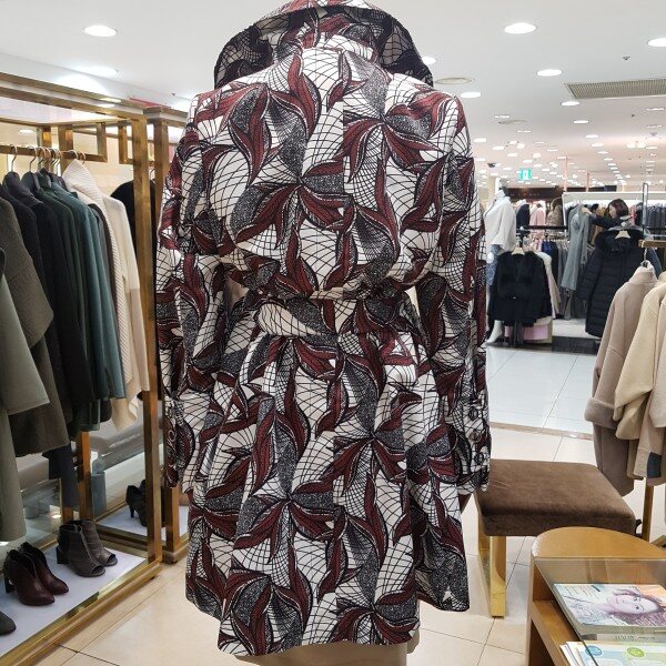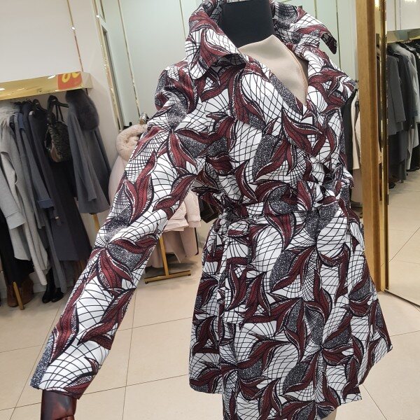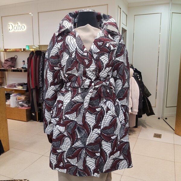 나염프린트가 화려함을 연출해주는 바바리 디자인입니다.