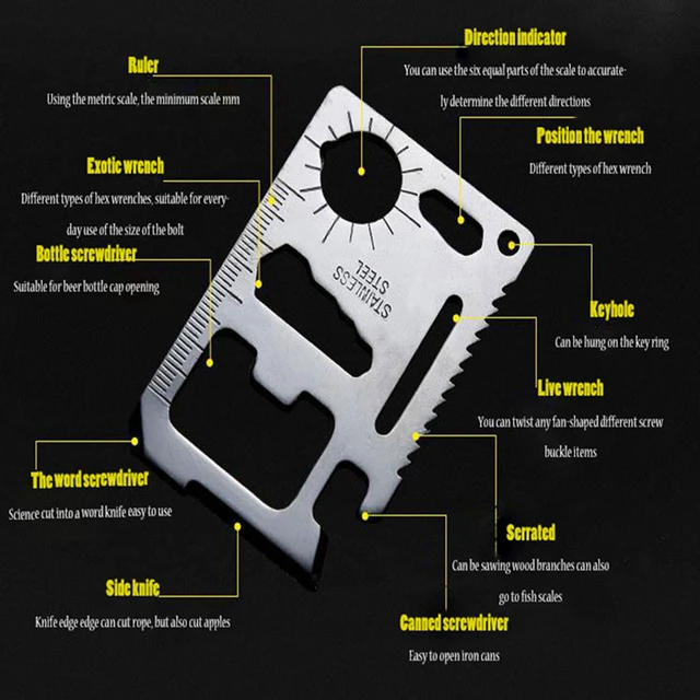 상품 내용 2017 새로운 5 개 전문 멀티 도구 11 in1 다기능 야외 사냥 서바이벌 캠핑 군사 전술 도구 장비 구체적인 항목: 브랜드 이름: MOONBIFFY 유형: 포켓, 멀티 도구 크기: 6.9x4.5x0.2 센치메터 응용 프로그램: 캠핑 나이프 유형: 멀티 나이프 블레이드 재질: 스테인레스 스틸 기능 구성: 각도기, 오프너, Woodsaw, 칼, 키 링 칼집 재질: 금속 야외 활동: 캠프 핸들 재질: 스테인레스 스틸 제품 설명: 이 미니 생존 도구 캠핑 이상적입니다, 하이킹, 배낭, 사냥, 트레일 타고 기능: 오프너 나이프 에지 병 오프너 통치자 병 오프너 나비 나사 렌치 2 위치 렌치 톱날 방향 보조 표시 4 위치 렌치 열쇠 구멍 사양: 재질: 420 고품질의 스테인레스 스틸 사이즈: 약 6.9x4.5x0.2 센치메터 (2.68 " x 1.78 " x 0.079 ") 무게: 약 30 그램 경도: 55HRC 포장 상세