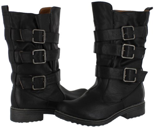 • Mid-calf boots have three strapping buckles and a folded shaft for major drama.