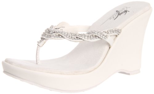 White bridal platform sandals with crystal trim on straps.