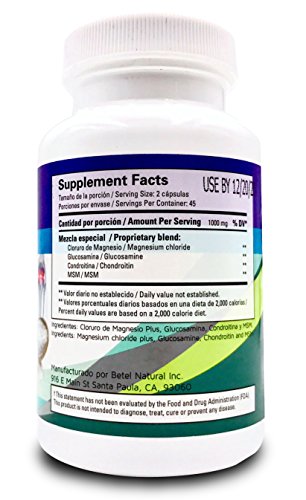 Magnesium Chloride is a natural mineral needed by our bodies to maintain a normal functioning skeletal and nervous system. When magnesium levels begin to fall and reach critically low levels, our bodies begin to suffer from many symptoms that can easily be treated and prevented with a healthy dose of magnesium. Unlike other types of magnesium (such as magnesium citrate), magnesium chloride is easily absorbed in the intestines and doesn't cause a laxative effect. Magnesium chloride has been shown to help reduce aches and pains associated with low magnesium levels in the body. Magnesium Chloride Capsules by Betel combine magnesium chloride, MSM, Glucosamine, and Chondroitin to help combat joint pain.Feature