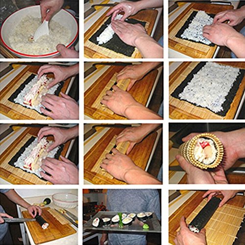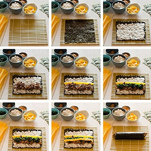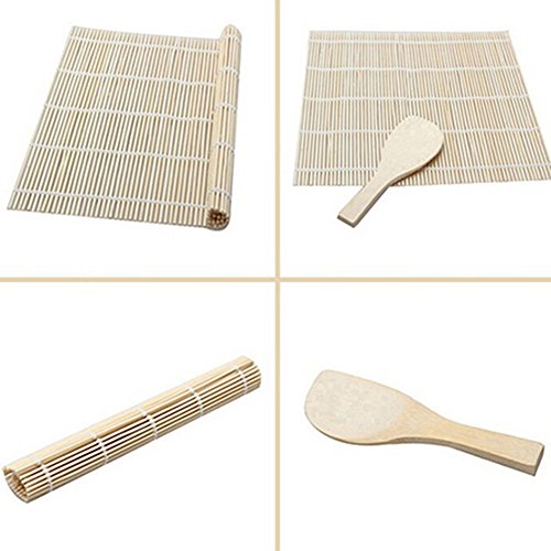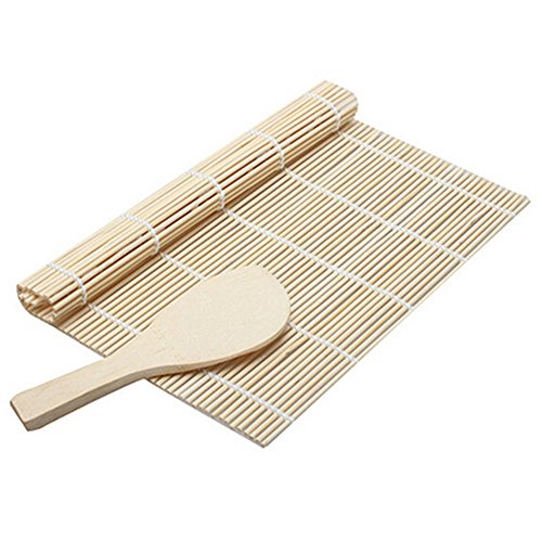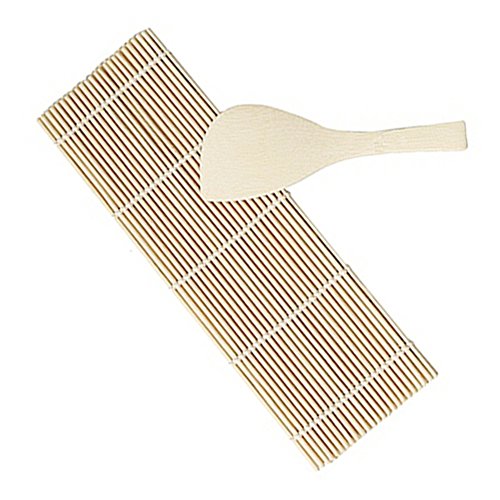 Studio : BaoST Publisher : BaoST Product Description This professionals use equipment can help your homemade sushi be tasty. Bamboo mats are bound together with twine and provide a non-stick surface for your rolling practice. Also included is a rice paddle which is used for mixing rice vinegar into the sushi rice without snapping the grains. It's also great when preparing other dishes as the wood will not damage non-stick and other cookware. Great kitchen tools for sushi making lover. Type: Sushi Rolling Mat Material: Bamboo, Wood Features: Useful, Safe, Sushi Rolling Mat Paddle Set, Kitchen Tools Sushi Rolls Size: 24cm x 24cm/9.45" x 9.45" (Approx.) Sushi Paddle Size: 14cm x 5cm/5.51" x 1.97" (Approx.) Package Includes: 1 x Sushi Rolling Mat 1 x Rice Paddle