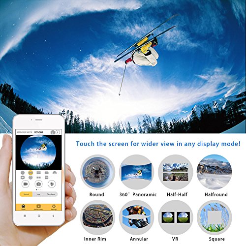 - Built-in WIFI&APP: WIFI connection is compatible with Android and IOS devices,Phone APP can support 8 models: Half-Half mode, VR mode, Square mode, Round mode, Inner Rim mode, Half round mode, Annular mode, 360°panoramic mode. You can also experience 3D effect mobile VR mode for videos and images. And you can share the moment to your social media at any time. Rugged built, shockproof and waterproof to 30M,dust-proof, anti-high and low temperature (-10℃-55℃)