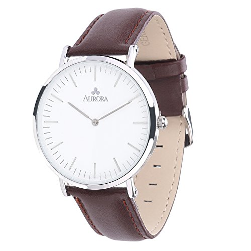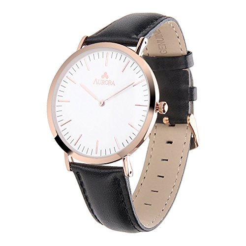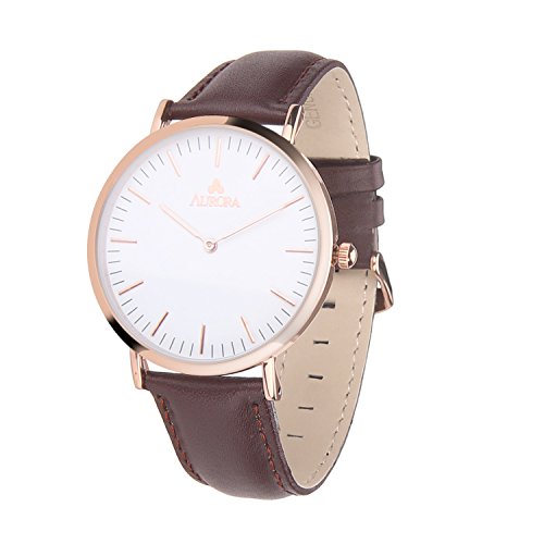 Simple, elegant and bold, the AURORA Women¡¯s Quartz Analog Watch makes it a classic and trend-setting timepiece great for everyday wear. The watch is constructed with a stainless steel case polished with top-level rose gold color and a comfortable dark brown leather bracelet with an adjustable buckle clasp. A durable mineral window protects the white dial face, which cleanly features rose gold-tone hour indexes and rose gold-tone minute markers, and complementary watch hands. It provides both decoration and practicality to women in any occasions.Feature