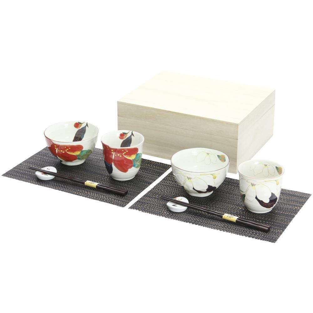 レトロな山茶花と木蓮が華やかなペア食器セット。大切な方へのギフトとしても最適です。 |