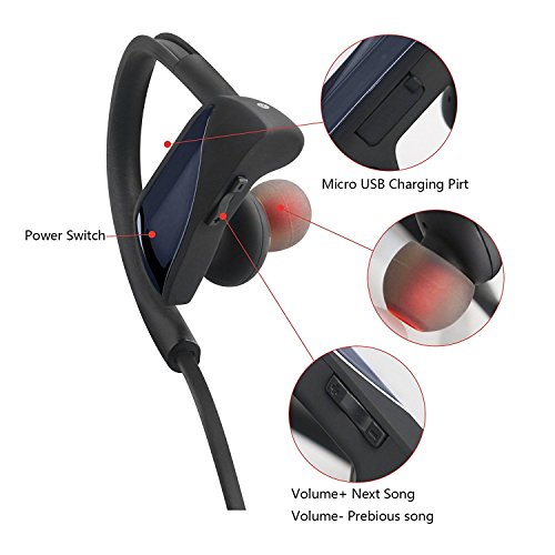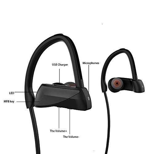 -. Feature : GOOD SOUND QUALITY AND LONG WORKING TIME: The headphones with bluetooth noise cancelling and super bass that you have good sound quality while wearing it to listen to music. The wireless earbuds with long battery life:1-2 hours charge time,6-8 hours play time, 220 hours standby time, long enough for workout or work. / BLUETOOTH EARBUDS FOR RUNNING: The sport wireless bluetooth earphones support Bluetooth Version 4.1. Easy and fast pairing with smartphones, tablets and other Bluetooth enabled music devices; More efficient energy connection, and it can work up to 10 meters / PRODUCT QUALITY STANDARD ARE GUARANTEED: 1 Year Warranty, if the item you receive is defective, we will full refund or resend a replacement without cost / STYLISH & COMFORTABLE EARBUDS DESIGNED: Keep the earphone in ear easily while running and working. Many people who love sports are looking for comfortable headphones. Our Bluetooth headset equipped with convenient earhooks is best for running. This wireless earphones are stylish and lightweight, so you won't even feel them while do exercise / SETUP EASILY: It has a voice prompt that says when it's on, pairing, connected, signal lost and off. And easy to set up the volume level or turn off. It turns the headphones on and off, connects them with other devices, and enables and disables calls. It can be ensured that you won't miss an important call while running.